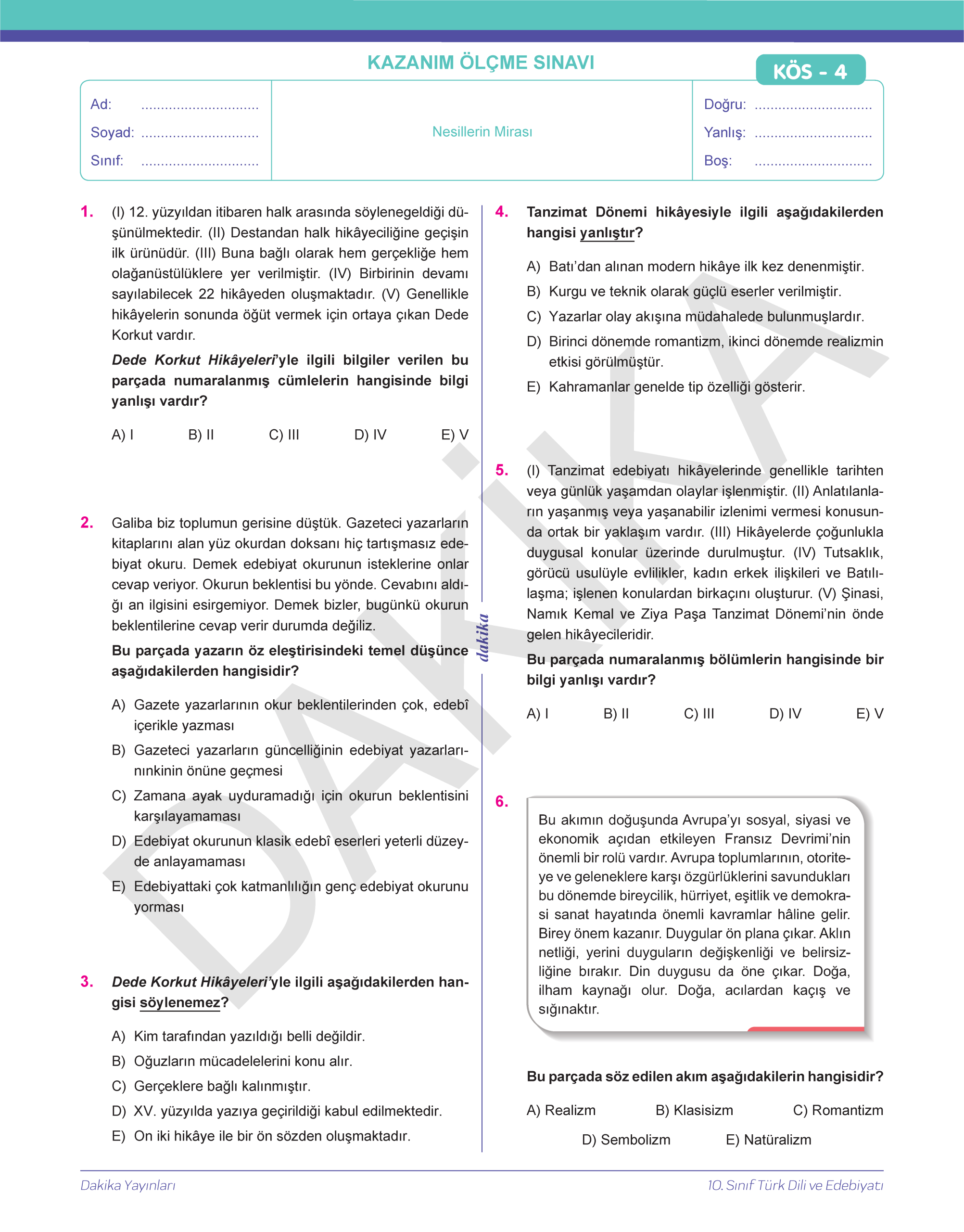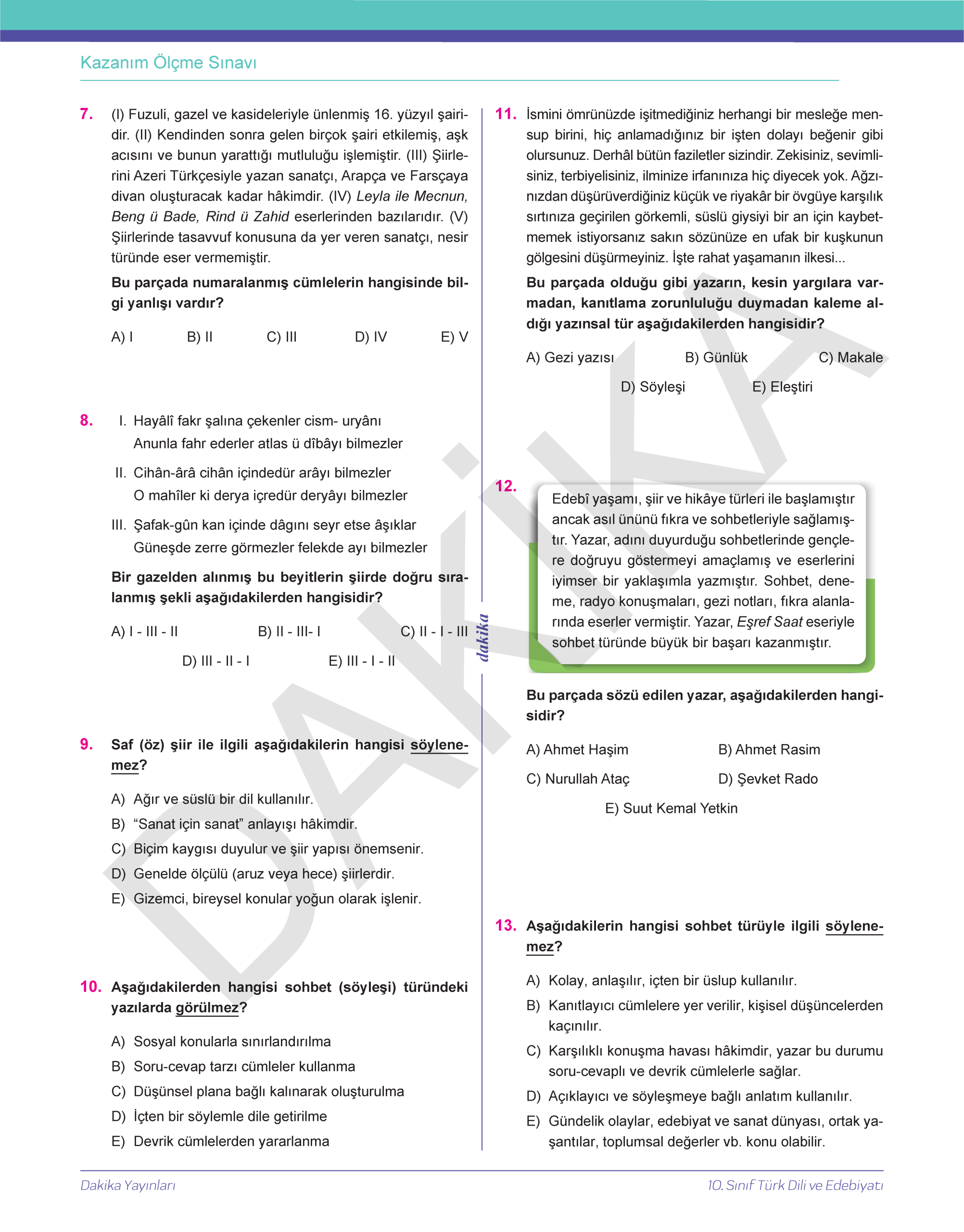 10. SINIF 20 DAKİKADA TÜRK DİLİ VE EDEBİYATI YAPRAK TEST